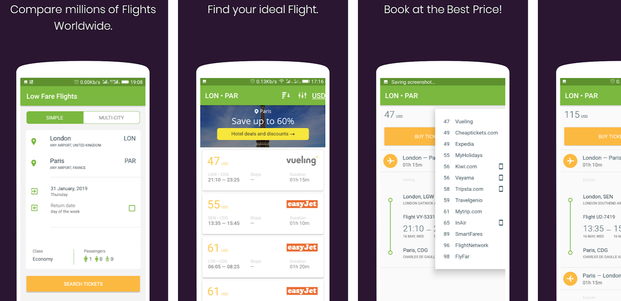 Low Fare Flights app technology matches travelers with top travel sites based on their search criteria. For example, you can compare fares from multiple travel sites side-by-side to find the best deal and booking flights, all within seconds of entering your travel information.
