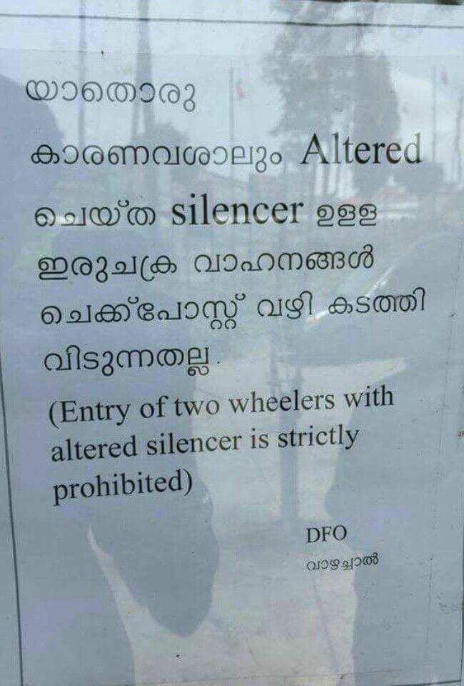 ഇതിനു പുറമെ ഇത്തരത്തിൽ സൈലന്സര് മാറ്റി സ്ഥാപിച്ചു യാത്ര ചെയ്യുന്നവർക്ക് എട്ടിന്റെ പണിയുമായി ഫോറസ്റ്റ് ഡിപ്പാർട്ടുമെന്റും എത്തിക്കഴിഞ്ഞു.വാഴച്ചാൽവഴി ഇത്തരത്തിൽ മാറ്റം വരുത്തിയ സൈലന്സര് ഉള്ള ഇരു ചക്ര വാഹനങ്ങൾ കടത്തി വിടുകയില്ല എന്ന് വാഴച്ചാൽ DFO ഉത്തരവിറക്കി.