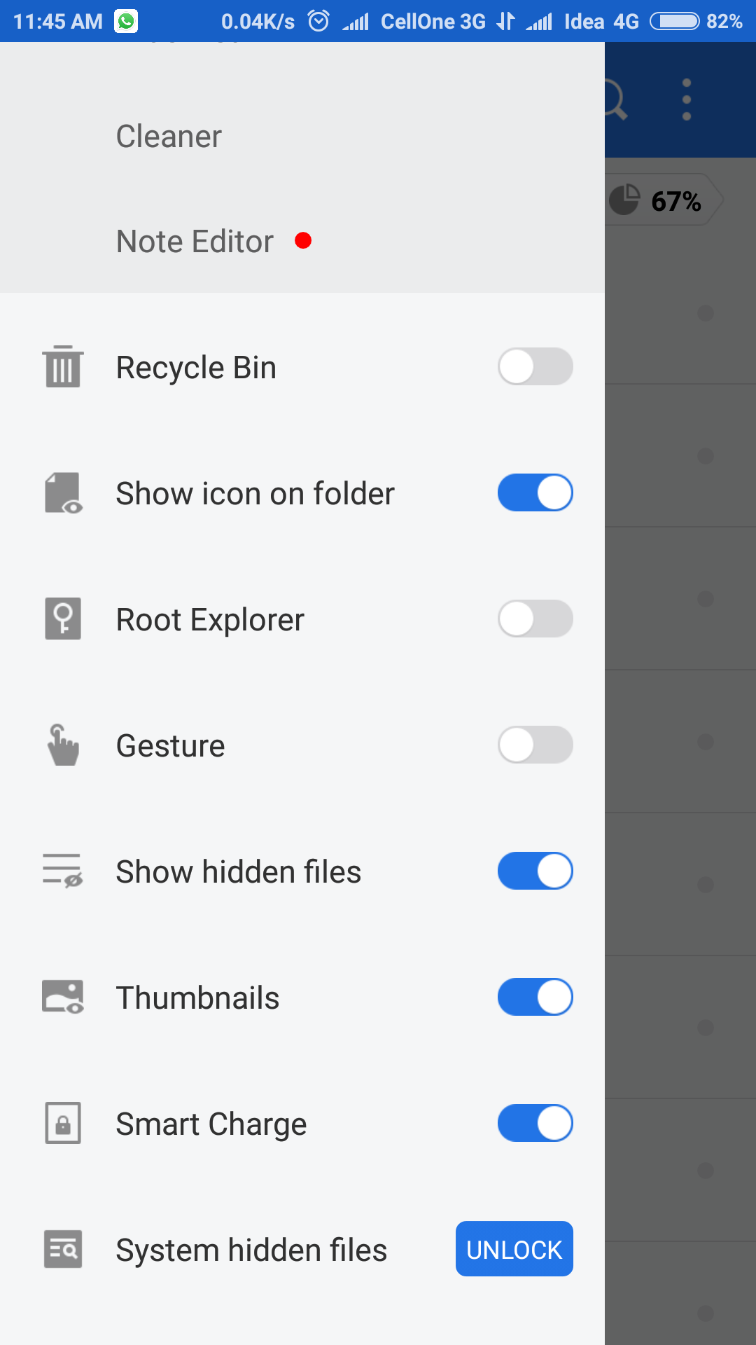 • തുറന്ന് വരുന്ന പേജിൽ ഏഴോ എട്ടോ ഫോൽഡറുകൾ ഉണ്ടാവും. എന്നാൽ സ്റ്റാറ്റസ് സേവ് ആയിരിക്കുന്ന ഫോൽഡർ ഹിഡൻ ചെയ്ത് വെച്ചിട്ടുണ്ടാവും. സ്റ്റാറ്റസിന്റെ ഫോൽഡർ കാണുന്നതിനായി ഫയൽ മാനേജറിലെ സെറ്റിംഗ്സിൽ ഹിഡൻ ഫോൽഡർ/സിസ്റ്റം ഫോൽഡർ എന്ന ഓപ്ഷൻ എനബിൽ ചെയ്യുക.