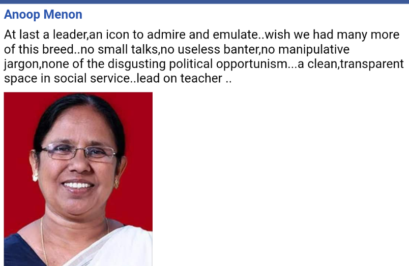 ”ആരാധന തോന്നുന്നൊരു നേതാവ് ഇതാ. ഇതുപോലുള്ള നേതാക്കൾ ഇനിയും ഉണ്ടായിരുന്നെങ്കിലെന്ന് ഞാൻ ആഗ്രഹിച്ചു പോകുന്നു. അനാവശ്യമായ പ്രയോഗങ്ങളില്ല. അമിതമായ സംസാരമില്ല, രാഷ്ട്രീയപരമായ അവസരവാദങ്ങളില്ല. ടെക്നിക്കല് വാക്കുകൾ വളച്ചൊടിക്കാറില്ല. ശുദ്ധവും സുതാര്യവും ആയ രാഷ്ട്രീയ സേവനം.. ടീച്ചറിനിയും ജനങ്ങളെ നയിക്കുക”.