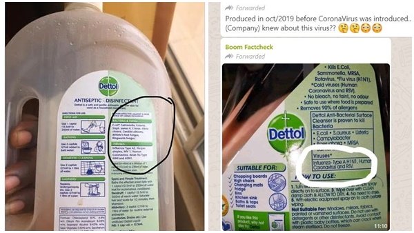 2019 ഒക്ടോബറിൽ പാക്ക് ചെയ്ത ഡെറ്റോളിന്റെ പുറം ലേബലിൽ എങ്ങനെ കൊറോണ വന്നു എന്ന രീതിയിൽ പലരിലും സംശയം ഉണർന്നു.ഈ പ്രചരണങ്ങൾക്ക് ഒരു വാസ്തവവും ഇല്ല എന്നാണ് ബ്ലൂം ലൈവ് ന്റെ ഫാക്ട് ചെക്കിങ് വിഭാഗം കണ്ടെത്തിയത്.ഇപ്പോൾ ലോകം മുഴുവൻ പടരുന്ന കൊറോണ വൈറസിന് 2019 ഒക്ടോബറിൽ പുറത്തിറങ്ങിയ ഡെറ്റോളിന്റെ പുറം ലേബലിൽ ഉള്ള കോറോണയുമായി ഒരു ബന്ധവുമില്ല.