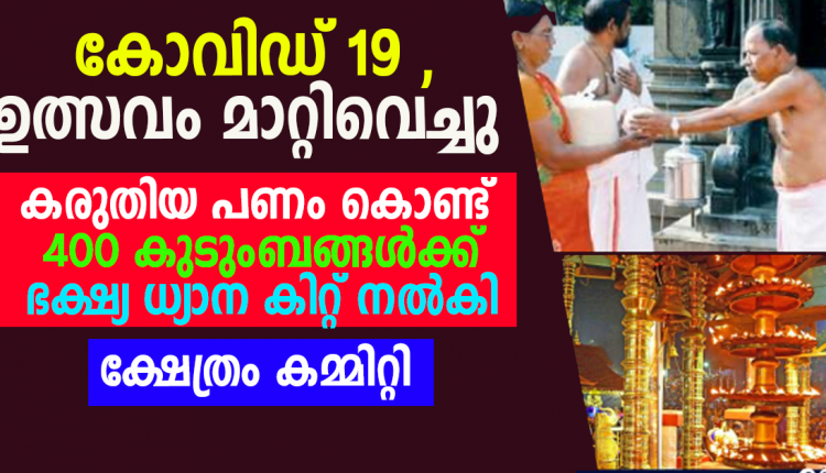 കൊറോണ കാരണം ഉത്സവം മാറ്റി വെച്ചു.ഉത്സവത്തിനായി കരുതിയ പണം കൊണ്ട് 400 മത്സ്യത്തൊഴിലാളി കുടുംബങ്ങള്ക്ക് ഭക്ഷ്യധാന്യ കിറ്റ് നല്കി ക്ഷേത്ര കമ്മിറ്റി