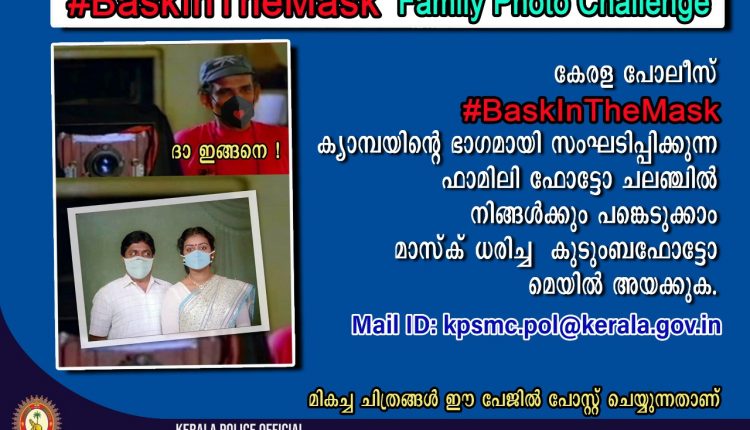 കേരള പോലീസിൻറെ “ബാസ്ക് ഇൻ ദി മാസ്ക് “ക്യാമ്പയിൻ്റെ ഭാഗമായി സംഘടിപ്പിക്കുന്ന ഫാമിലി ഫോട്ടോ ചലഞ്ചിൽ ഏവർക്കും പങ്കെടുക്കാവുന്നതാണ് .മാസ്ക് ധരിച്ചിട്ടുള്ള കുടുംബ ഫോട്ടോയാണ് നിർദ്ദേശിച്ചിട്ടുള്ള ഇമെയിൽ ഐഡിയിലേക്ക് അല്ലെങ്കിൽ ഫോൺ നമ്പറിലേക്ക് വാട്സ്ആപ്പ് ചെയ്യേണ്ടത്.