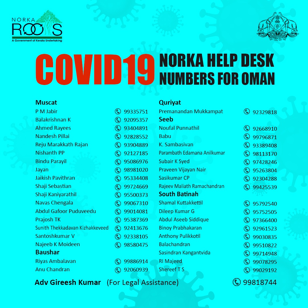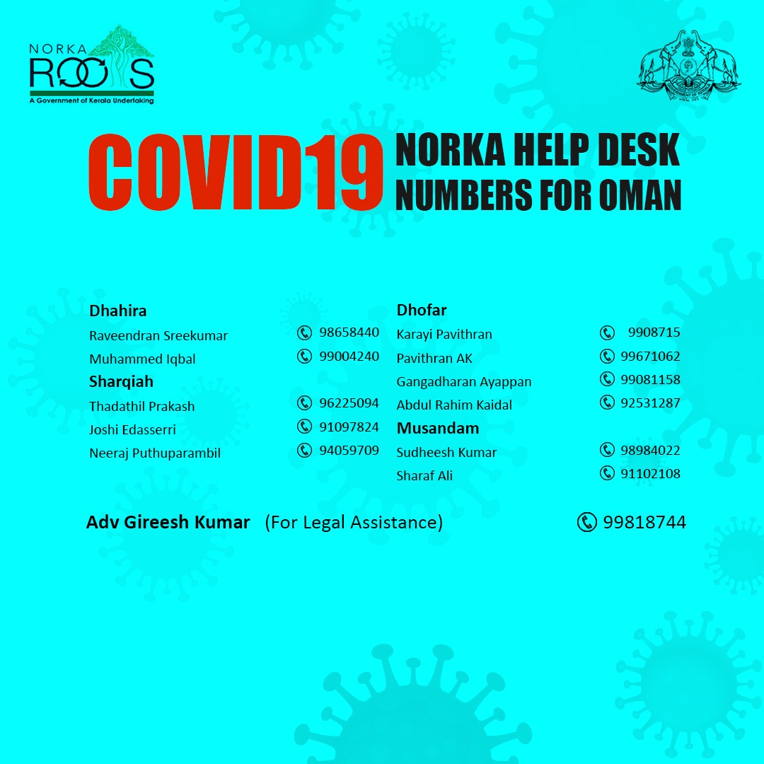 കോവിഡ് -19 പശ്ചാത്തലത്തിൽ പ്രവാസി മലയാളികൾക്കായി ഒമാനിൽ രൂപീകരിച്ച നോർക്ക ഹെൽപ്പ് ഡെസ്ക് നമ്പറുകൾ.