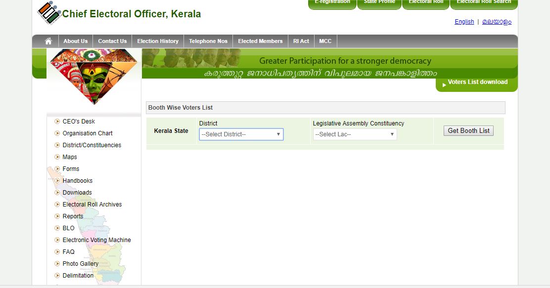 ആദ്യം ഇതിനായി വോട്ടർ പട്ടികയിൽ പേരുണ്ടോ എന്നാണ് നോക്കേണ്ടത് അതിനായി . http://www.ceo.kerala.gov.in/electoralrolls.html എന്ന വെബ്സൈറ്റിൽ കയറി നിങ്ങളുടെ ജില്ലാ ,അസംബ്ലി എന്നിവ സെലക്ട് ചെയ്തു ബൂത്ത് വൈസ് പട്ടിക എടുത്തു നിങ്ങളുടെ പേര് അതിൽ ഉണ്ട് എന്ന് ഉറപ്പു വരുത്തുക.