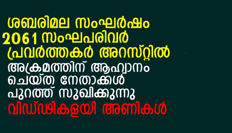 ശബരിമല പ്രശ്നത്തിന്റെ മറവിൽ അക്രമം അഴിച്ചുവിട്ട കൂടുതൽ പേർ അറസ്റ്റിൽ ആയി.ഇതുവരെ 2061 പേരോളം അറസ്റ്റിൽ ആയി.പ്രശ്നവുമായി ബന്ധപെട്ടു വാഹനങ്ങൾ തടഞ്ഞ സ്ത്രീകളും കുടുങ്ങും.ഇതുമായി ബന്ധപ്പെട്ട വിവിധ പ്രശ്നങ്ങളിലായി 450 നു മുകളിൽ കേസുകൾ ഇതുവരെ രജിസ്റ്റർ ചെയ്യപ്പെട്ടിട്ടുണ്ട്.