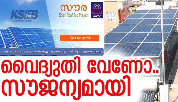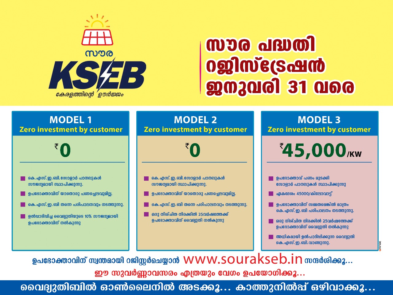 കെഎസ്ഇബിയുടെയും അനെർട്ടിന്റെയും സംയുക്ത സംരംഭമായ ‘സൗര’യിലെ പുരപ്പുറ സൗരോർജ പദ്ധതിക്കായുള്ള റജിസ്ട്രേഷൻ ഈ മാസം 31 വരെ നീട്ടി.