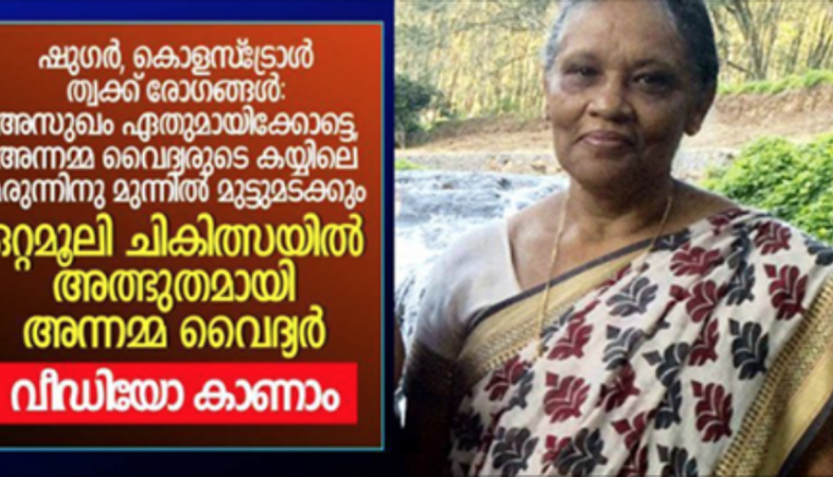 ഷുഗർ കൊളസ്ട്രോൾ സ്കിൻ രോഗങ്ങൾ പോലുള്ള ജീവിത ശൈലി രോഗങ്ങൾക്ക് ഒറ്റമൂലിയുമായി അന്നമ്മ വൈദ്യർ.അന്നമ്മ വൈദ്യരുടെ ഒറ്റമൂലിക്ക് പിന്നിലെ കഥകളും അന്നമ്മ വൈധ്യരെ കുറിച്ച് അറിയുവാനും വീഡിയോ കാണുക.