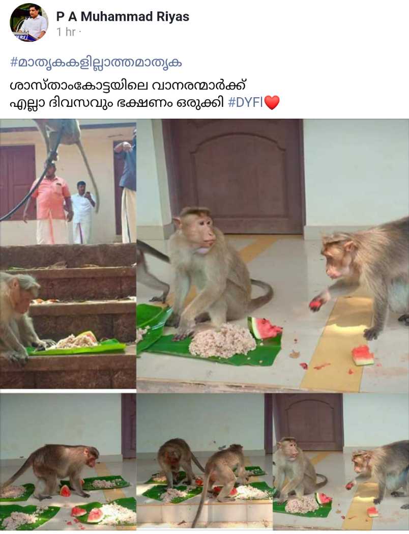 പട്ടിണിയിലായ കുരങ്ങന്മാർക്ക് ഭക്ഷണമൊരുക്കി ഡിവൈഎഫ്ഐയുടെ മാതൃക