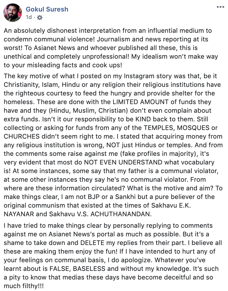 ഫേസ്ബുക്കിലൂടെ ആണ് വിവാദങ്ങൾക്ക് പ്രതികരണം അറിയിച്ചത്.ഹിന്ദുക്കളിൽ നിന്നോ അമ്പലങ്ങളിൽ നിന്നോ മാത്രമല്ല ഏത് മതത്തിന്റെയും ആരാധനാലയങ്ങളിൽ നിന്നും പൈസ ആവശ്യപ്പെടുന്നത് നന്നല്ല എന്നാണ് ഇൻസ്റ്റാഗ്രാം സ്റ്റോറിയിലൂടെ കുറിച്ചത് എന്ന് അദ്ദേഹം പറയുന്നു.ഞാൻ BJPയുമല്ല സങ്കിയുമല്ല എന്നാൽ സഖാവ് ഇ.കെ. നയനാറിന്റെയും സഖാവ് വി.എസ്. അച്യുതാനന്ദന്റെയും കാലങ്ങളിൽ നിലനിന്നിരുന്ന യഥാർത്ഥ കമ്മ്യൂണിസത്തിന്റെ കടുത്ത വിശ്വാസിയാണ് എന്നും ഫേസ്ബുക് പോസ്റ്റിൽ പറയുന്നു.പോസ്റ്റിന്റെ പൂർണ രൂപം താഴെ നൽകുന്നു.