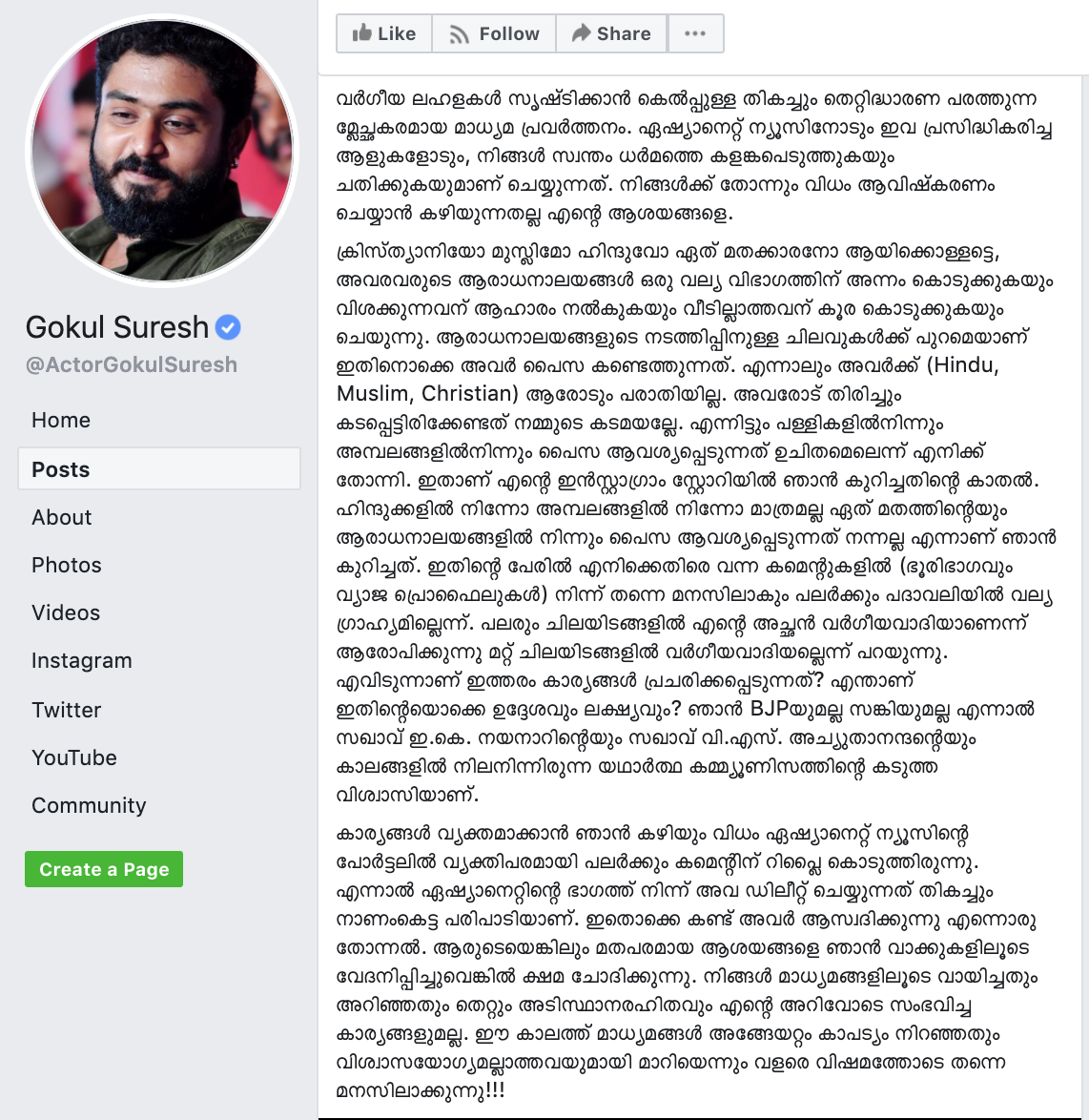 5 കോടി രൂപ ഗുരുവായൂർ ദേവസ്വം മുഖ്യമന്ത്രിയുടെ ദുരിതാശ്വാസ നിധിയിലേക്ക് കൊടുത്തതിനെ വിമർശിച്ചതുമായി ബന്ധപ്പെട്ട വിവാദത്തിൽ പ്രതികരണവുമായി ഗോകുൽ സുരേഷ്.5 കോടി രൂപ ഗുരുവായൂർ ദേവസ്വം മുഖ്യമന്ത്രിയുടെ ദുരിതാശ്വാസ നിധിയിലേക്ക് കൊടുത്തത് ശരിയായില്ല എന്നും, മുസ്ലിം പള്ളിയിൽ നിന്നോ ക്രിസ്ത്യൻ പള്ളിയിൽ നിന്നോ ഇത് പോലെ പണം ദുരിതാശ്വാസ നിധിയിലേക്ക് ഏറ്റെടുത്തിരുന്നോ എന്നും കഴിഞ്ഞ ദിവസം ഗോകുൽ സുരേഷ് തന്റെ ഇൻസ്റ്റാഗ്രാം സ്റ്റോറി ആയി ഇട്ടിരുന്നു,ഇതിനെതിരെ വിവാദങ്ങൾ ഉടലെടുത്തതോട് കൂടി ആണ് ഗോകുൽ സുരേഷിന്റെ പ്രതികരണം.