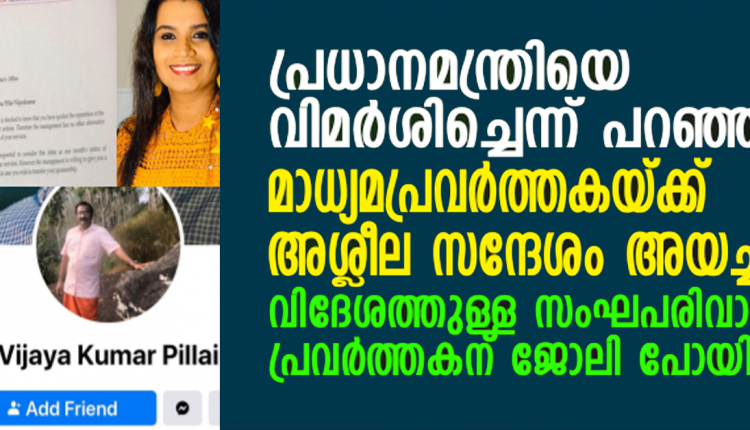പ്രധാനമന്ത്രിയെ വിമർശിച്ചതിന് മാധ്യമ പ്രവർത്തകക്ക് അശ്ളീല സന്ദേശം അയച്ച വിദേശത്തുള്ള സംഘപരിവാർ പ്രവർത്തകനെ ജോലിയിൽ നിന്ന് പിരിച്ചു വിട്ടു