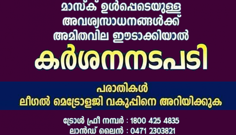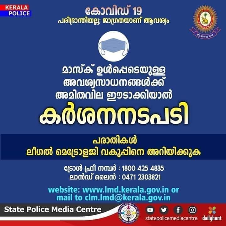 മാസ്ക് ഉൾപ്പടെ ഉള്ള ആവശ്യ സാധനങ്ങൾക്ക് അമിത വില ഈടാക്കുന്നതായി ശ്രദ്ധയിൽ പെട്ടാൽ നിങ്ങൾക്ക് ലീഗൽ മെട്രോളജി വകുപ്പിനെ ബന്ധപ്പെടാവുന്നതാണ്.