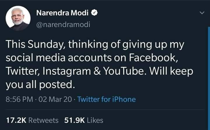 പ്രധാനമന്ത്രി നരേന്ദ്ര മോദി തന്റെ സോഷ്യൽ മീഡിയ അക്കൗണ്ടുകൾ ഉപേക്ഷിക്കുന്നത് പരിഗണിക്കുന്നതായി ഇന്നലെ ട്വിറ്ററിൽ അറിയിചിരുന്നു.