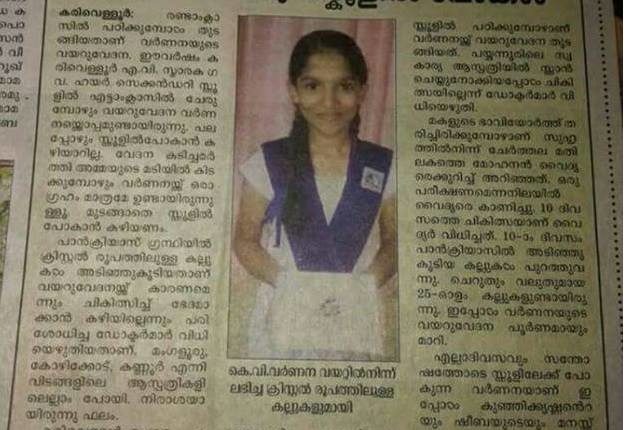 അതുകൊണ്ട് അമ്മാവൻ കല്ല് എവിടൂന്ന് വേണേലും എടുക്കും. (കയ്യാല കെട്ടാനും വീടു പണിയാനും അമ്മാവന്റെ പാരിപ്പള്ളിയിലെ വ്യാജ ചികിൽസാലയവുമായി ബന്ധപ്പീടുക) അതിനിപ്പൊ അമ്മാവനു പിത്തസഞ്ചി തന്നെ വേണമെന്ന് യാതൊരു നിർബന്ധവുമില്ല. അതിന്റെ ഏറ്റവും പുതിയ ഇരയാണ് ദേ ഈ കുട്ടി. ടി വാർത്ത വന്നത് ഏത് പത്രത്തിലാന്ന് അറിയില്ല. പക്ഷേ കാശുകൊടുത്ത് വരുത്തിച്ച വാർത്തയാകാനുള്ള സാദ്ധ്യത തള്ളിക്കളയാനാകില്ല.