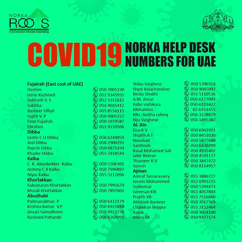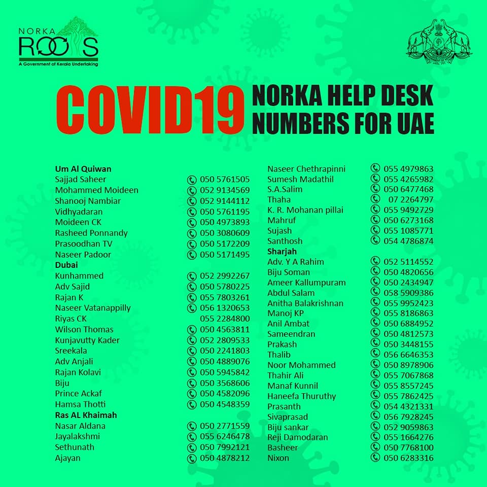 കോവിഡ് -19 പശ്ചാത്തലത്തിൽ പ്രവാസി മലയാളികൾക്കായി യു.എ.ഇയിൽ രൂപീകരിച്ച നോർക്ക ഹെൽപ്പ് ഡെസ്ക് നമ്പറുകൾ.