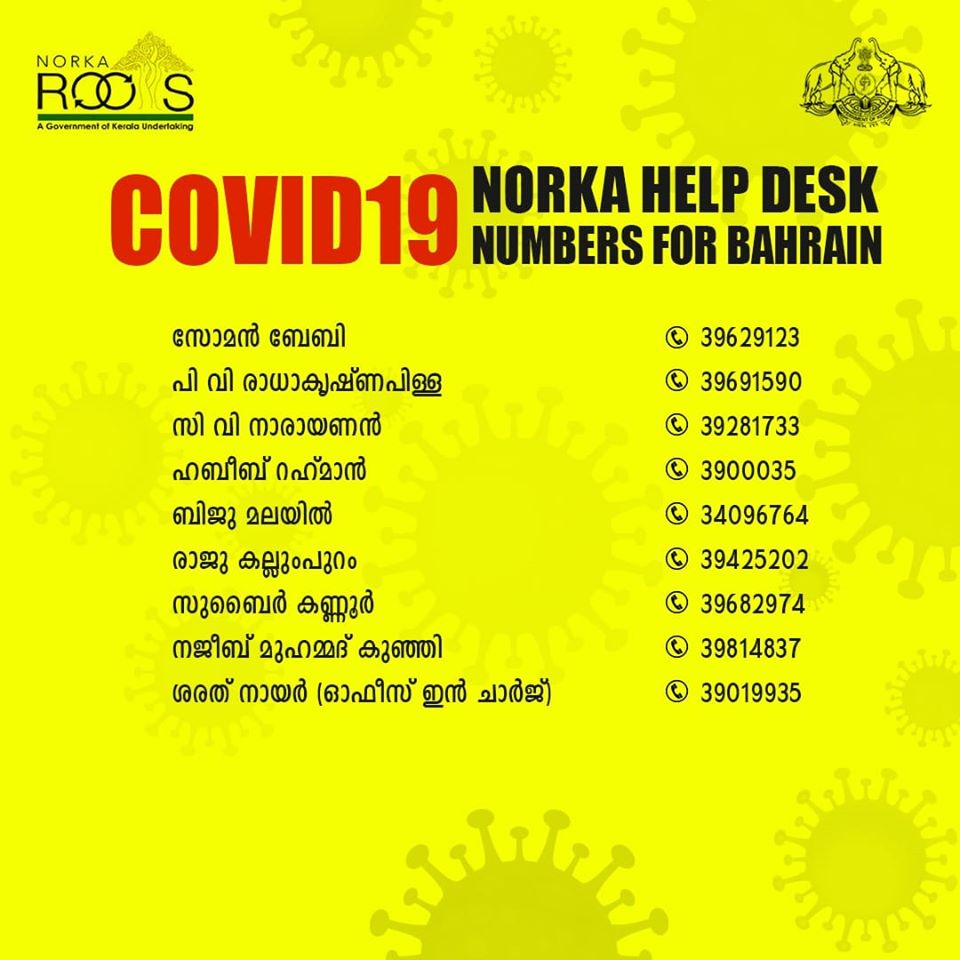കോവിഡ് -19 പശ്ചാത്തലത്തിൽ പ്രവാസി മലയാളികൾക്കായി ബഹ്റൈനിൽ രൂപീകരിച്ച നോർക്ക ഹെൽപ്പ് ഡെസ്ക് നമ്പറുകൾ.