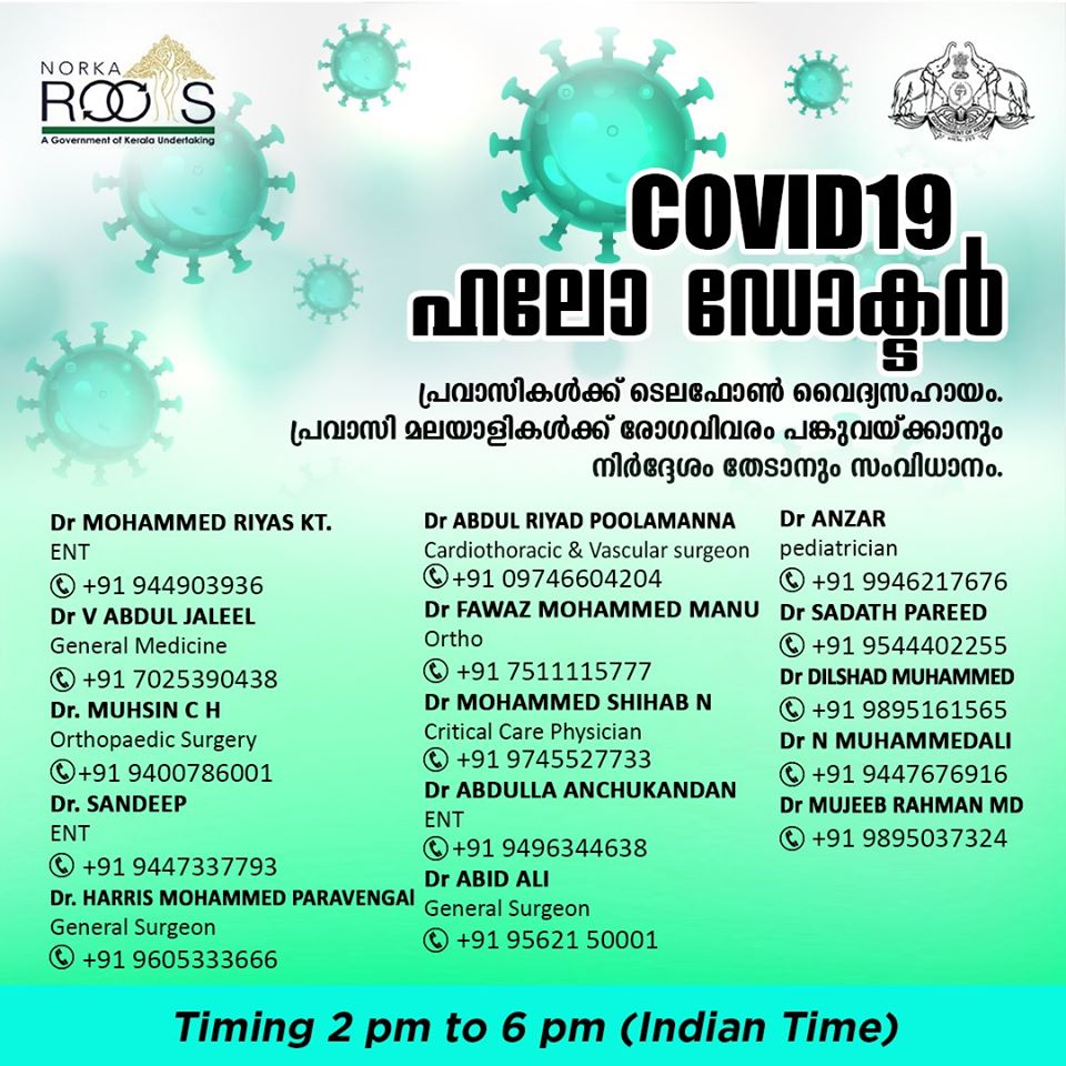 ഇന്ത്യൻ സമയം ഉച്ചക്ക് രണ്ടുമണി മുതൽ വൈകിട്ട് ആറുവരെ ആണ് ടെലിഫോണിലൂടെ ഡോക്ടറുടെ സേവനം ലഭ്യമാവുക.മലയാളി പ്രവാസികൾ കൂടുതൽ ഉള്ള രാജ്യങ്ങളിൽ വിധസംഘടനകളുമായി ചേർന്ന് അഞ്ചു കോവിഡ് ഹെല്പ് സെന്ററുകളും നോർക്ക തുടങ്ങിയിട്ടുണ്ട്.നിലവിൽ ലഭിക്കുന്നത് ജനറൽ മെഡിസിൻ, ജനറൽ സർജറി, ഗൈനക്കോളജി, പീഡിയാട്രിക്സ്, ഓർത്തോ, ഇ.എൻ.ടി.ഒഫ്താൽമോളജി വിഭാഗം ഡോക്ടർമാരുടെ സേവനമാണ്.