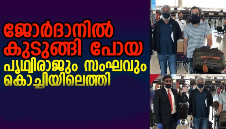 കൊറോണ വൈറസ് പകർച്ചവ്യാധികൾക്കിടയിൽ ജോർദാനിൽ കുടുങ്ങിയ നടൻ പൃഥ്വിരാജ് സുകുമാരൻ ഉൾപ്പടെയുള്ള ആട് ജീവിതം സിനിമയുടെ ഭാഗമായുള്ളവർ തിരികെ കേരളത്തിലെത്തി.ലോകത്തിന്റെ വിവിധ ഭാഗങ്ങളിൽ കുടുങ്ങിയ ഇന്ത്യക്കാരെ തിരിച്ചെത്തിക്കാൻ ശ്രമിക്കുന്ന വന്ദേ ഭാരത് മിഷന് കീഴിൽ ആണ് സുരക്ഷിതമായി ഇന്ത്യയിലേക്ക് എത്തിച്ചത്.വെള്ളിയാഴ്ച രാവിലെ കൊച്ചി വിമാനത്താവളത്തിലാണ് നടനും മറ്റ് 57 പേരുമടങ്ങുന്ന സംഘം തിരികെ എത്തിയത്.