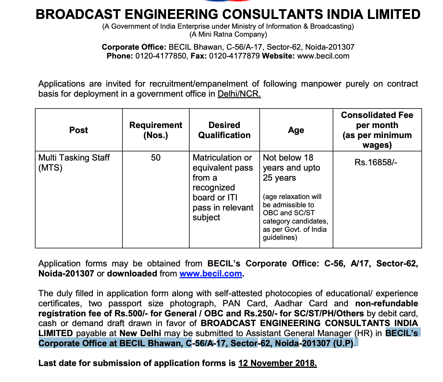 പത്താം ക്ലാസ് പാസായവർക്ക് ഗവർമെന്റ് കമ്പനി ആയ BROADCAST ENGINEERING CONSULTANTS INDIA LIMITED ൽ കോൺട്രാക്ട് ബേസിൽ തൊഴിൽ അവസരങ്ങൾ.Multi Tasking Staff (MTS) എന്ന പൊസിഷനിൽ ആണ് തൊഴിൽ അവസരങ്ങൾ.കൂടുതൽ വിവരങ്ങൾ താഴെ നൽകുന്നു.